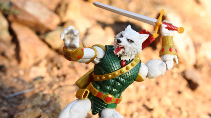 The wolf portrait has a lot of character and I also like that the little gold cap sleeves are separate pieces that don’t impede movement. The articulation is pretty much Marvel Legends standard, but the neck has especially nice movement at the ball joints. I think this because they cut out a bit of a notch at the back of the ball joint where it connects to the body allowing the figure to look up well. There’s also a really long barbell which is covered by a furry sleeve which allows a lot of movement.