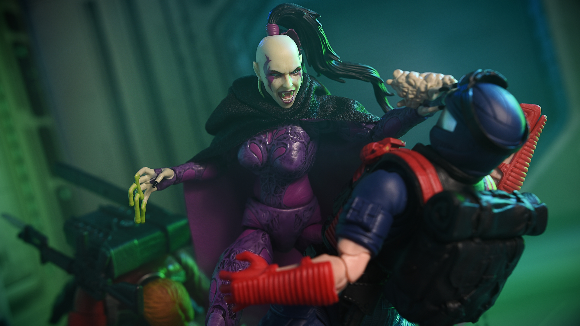 One of my favorite accessories is the extra head with the fangs. I don’t recall that from the film, but the snake fangs feel appropriate for a lady named Pythona. The paint on the figure is fantastic with some crazy snake eyes on a creepily pale plastic skin tone. The tattoos around the eyes are so sharp and cool looking, this might be weird, but it really makes me want them to make some Jem and Misfits with their crazy makeup. They would nail that!