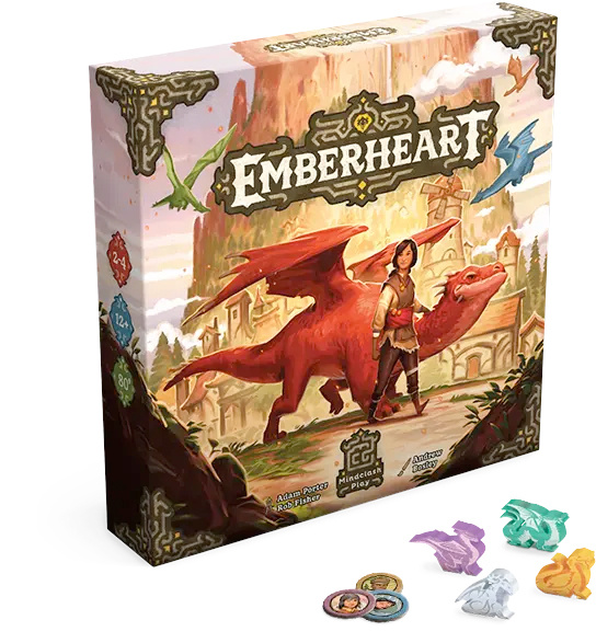Emberheart was created by Adam Porter and Rob Fisher (designers of Kompromat, Happy Hoppers) and features artwork by Andrew Bosley (Everdell, Tapestry). The game includes 1 main board, 4 player boards, 139 cards, 222 tokens, 4 dragon pawns, and a scoring pad. It is intended for two to four players, ages twelve and up, and takes a little over an hour to play. MSRP is $39.00.Source: ICV2